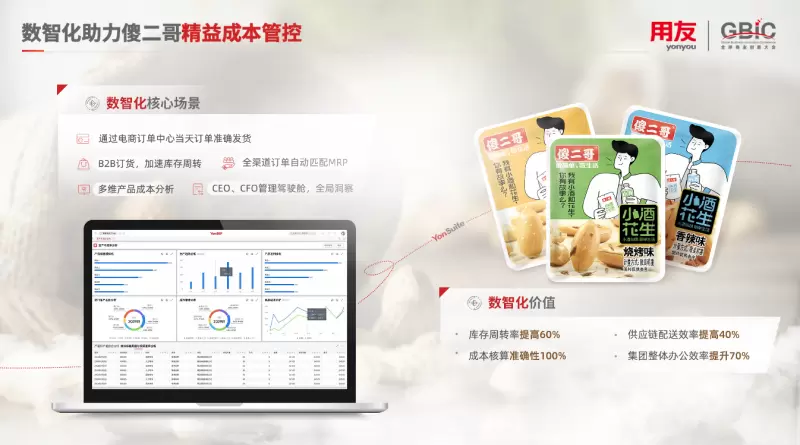 将“一颗花生做到极致”的东莞傻二哥食品,通过用友YonSuite成功优化了电商订单处理流程,通过B2B订货和全渠道订单自动化,加速库存周转,实现了供应链的高效配送。实现库存周转率的60%提升,供应链配送效率的40%增长,成本核算的100%准确性。