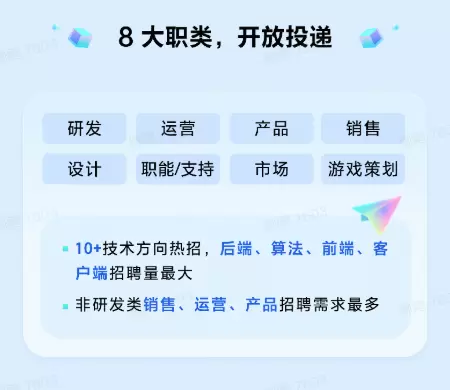 据了解,本次招聘面向2025届应届生,即在2024年9月至2025年8月期间毕业,待招岗位涵盖研发、运营、产品、销售、设计、职能/支持、游戏策划、市场在内的8大职类。
