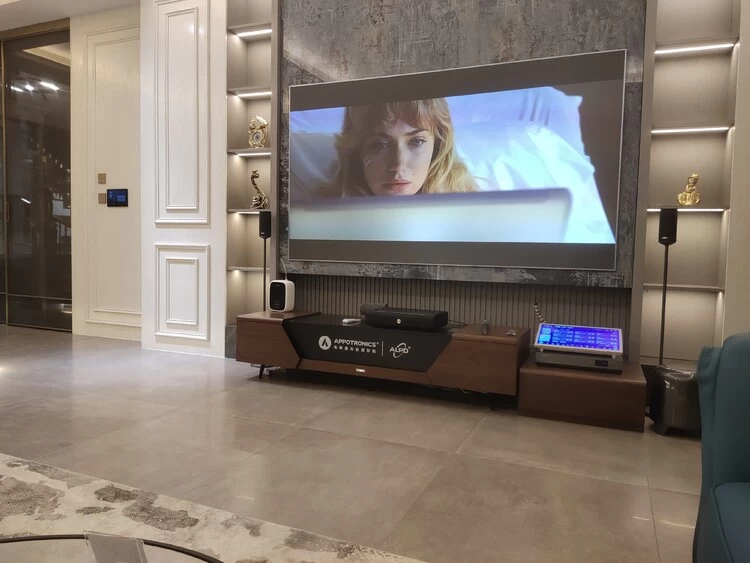 Partyhouse派对屋皇后加强版的落地支架安装简易且不会露出线材,搭配无线后环绕功放轻松摆放,假若是后装用户有布线杂乱的烦恼,前来体验时也能直观展示,以此来打消用户的顾虑。