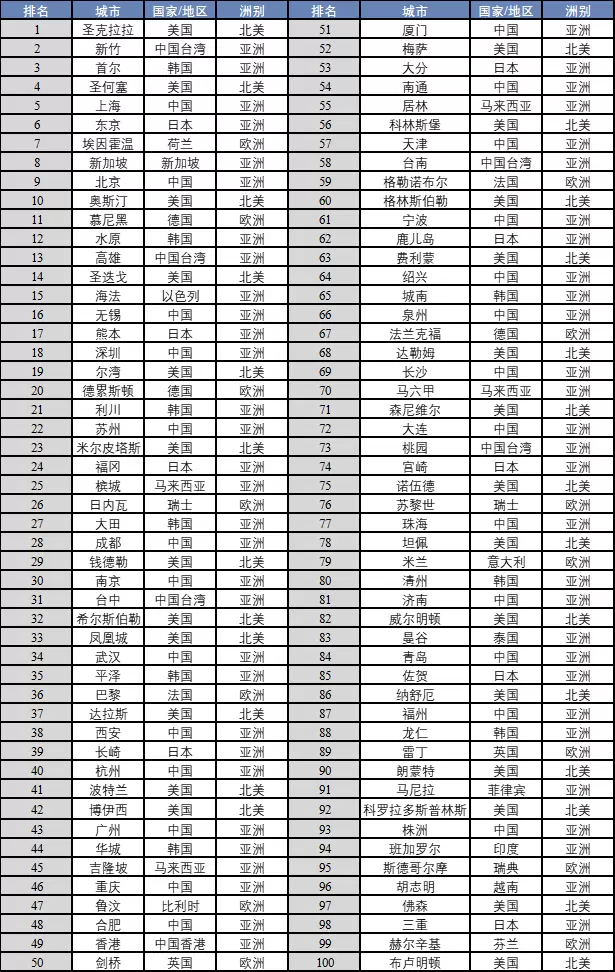 为充分评估全球主要集成电路产业城市综合竞争力,WICA采用25个指标建构了集成电路产业城市综合竞争力评估指标体系,从经济实力、成长动力、内生支撑、产业能级及合作发展5个方面进行综合评估。综合结果显示,圣克拉拉、新竹、首尔、圣何塞、上海、东京、埃因霍温、新加坡、北京、奥斯汀位于全球集成电路产业综合竞争力百强城市前十名。
