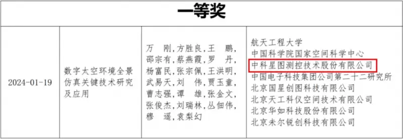 该成果由星图测控联合航天工程大学、中国科学院国家空间科学中心、中国电子科技集团公司第二十二研究所、北京国星创图科技有限公司、北京天工科仪空间技术有限公司、北京华如科技股份有限公司、北京未尔锐创科技有限公司七家单位共同完成,面向我国航天事业发展对太空环境仿真的迫切需求,系统开展数字太空环境全景仿真理论和技术研究,填补了国内相关领域研究空白,具有重大理论与应用价值,目前已成功应用于嫦娥工程、载人航天、卫星互联网等重大航天工程的规划论证、工程实施与常态保障,并取得了重大的经济效益与社会影响。