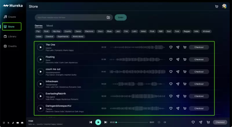 在Mureka创作歌曲将消耗用户付费积分(credits)。歌曲创作完成后,用户可以下载创作证明,并申请在Mureka歌曲商店(Store)中进行展示出售。也可以付费购买歌曲的伴奏和分轨音频。用户在平台出售歌曲的收益,Mureka会按既定比例进行抽佣。
