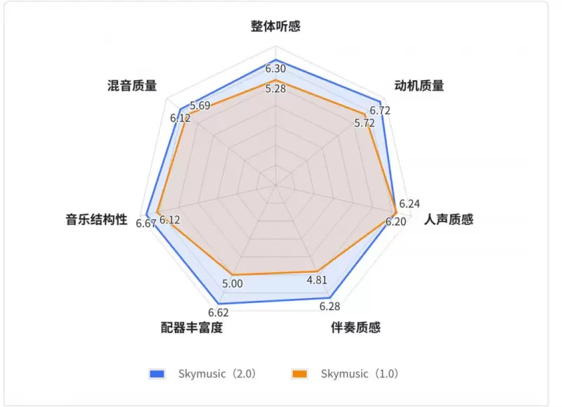 同时,Skymusic2.0在音乐旋律质量、伴奏质量、配器丰富度、音乐结构性和混音质量等维度均有大幅提升,在人声音质、人声自然度和发声可懂度上维持业内领先的SOTA水平。