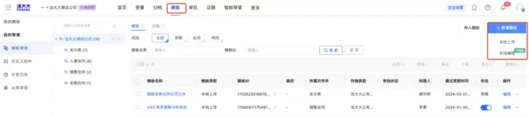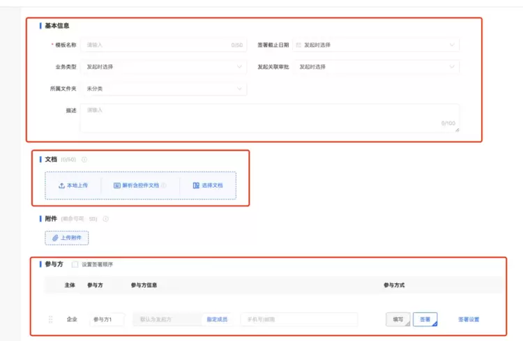 1.创建模板(普通模板、在线模板),并配置模板基础信息(模板类型、参与方设置等)。