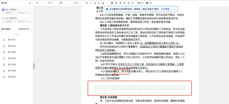 2. 设置模板中需要填写的字段、控件等,在线模板可对模板内容进行适当修改,并可添加在线表格,实现表格行列自适应。