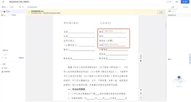 以前:需要HR将多个员工的合同一一填写后打印,给到员工填写相关的个人信息并签字,HR确认填写内容无误后,提交内容等待公司盖章,盖章完毕再将劳动合同发放员工。