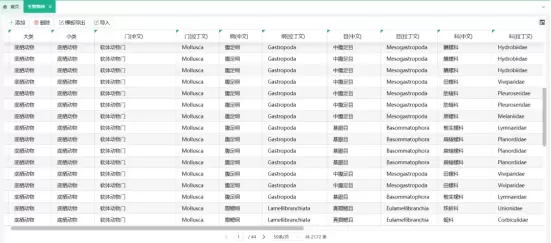 将常见生物物种的信息(包括中文和拉丁文名称)按照门、纲、目、科、属、种的分类体系进行添加和导入,以便于实验室检测信息的查询和选择。
