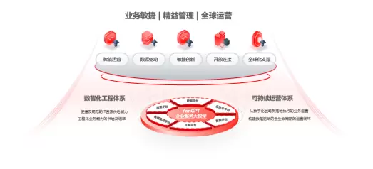 企业数智化底座的构建需要具备多方面的能力。首先是业务掌控能力,基于对业务的理解与沉淀,打造更加贴近需求的应用平台;其次是数据掌控能力,使数据成为真正的企业资产并在企业内流动起来,让数据反哺业务;新增的 AI 维度则为企业插上智能的翅膀,帮助企业实现智能驱动。用友的数智化底座通过融合六大平台、YonGPT 大模型以及工程化体系和运营体系能力,可以帮助企业搭建起智能运营、数据驱动、敏捷创新、开放连接和全球化支撑等核心能力。