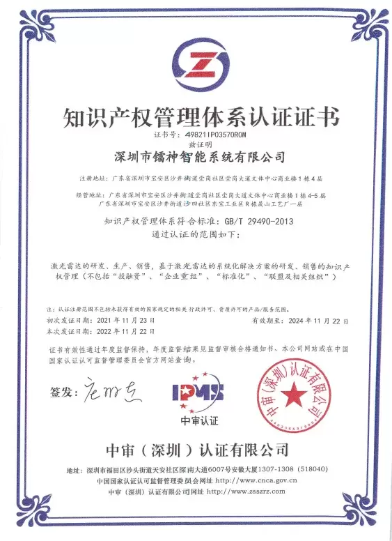 镭神智能深知知识产权对于企业发展的重要性,因此始终将知识产权管理作为企业发展的重中之重。公司建立了完善的知识产权管理体系,获得知识产权等管理体系认证,涵盖了专利申请、保护、运用等多个环节,确保了公司知识产权的完整性和有效性。