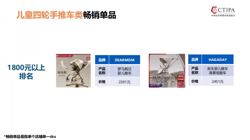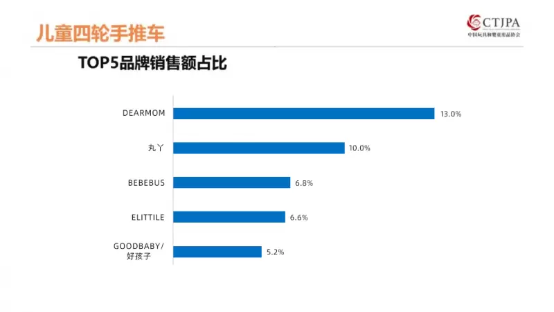 其中,DearMom作为高端婴儿推车的领军品牌,以13.0%的市场份额位列儿童四轮手推车品类榜首。且销售额占比较上年增长了1.6个百分点,显示出品牌强大的用户黏性和受欢迎程度。