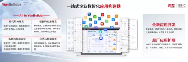 用友网络副总裁兼iuap开发平台架构部总经理刘剑介绍,YonBuilder为企业提供一站式企业数智化应用构建器,支持低代码AI开发、低代码应用开发、低代码集成连接、自助式数据分析等需求。