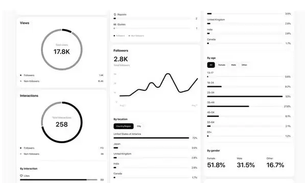 今天宣布的其他功能可能更适合管理品牌账户的营销人员。例如,一个新的Insights页面为账户提供了数据分解,包括粉丝的年龄、互动情况和视图”- 这是Instagram一直在推动的主要衡量内容表现的方式。一些Threads用户本周提前获得了Insights功能。Meta还宣布,即将推出提前安排Threads帖子的功能。新功能将首先在网页上推出,移动版本稍后推出。