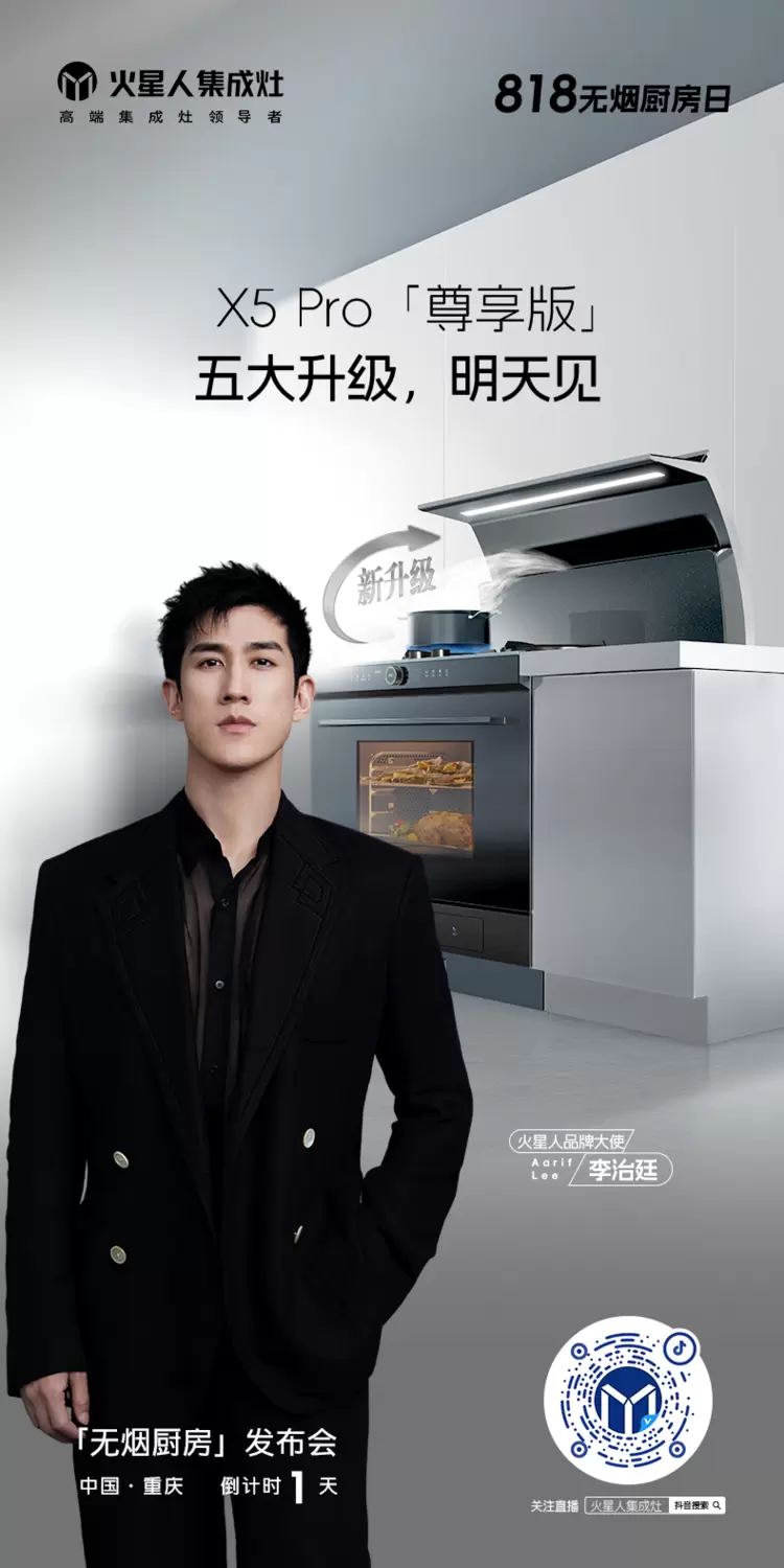 明星李治廷将作为无烟厨房品牌大使亲临现场,与嘉宾一同真实体验 X5 Pro、ET70 产品。炒辣椒过程中,让您亲眼见证火星人集成灶超强吸烟能力,其到来不仅增添璀璨星光,更传递对无油烟厨房的支持与倡导。
