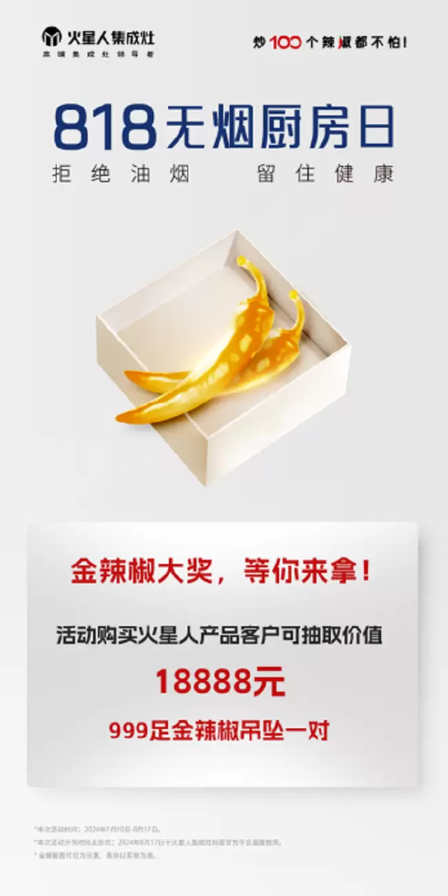 2024 年 8 月 17 日,火星人“无烟厨房”发布会将在重庆震撼登场!在热情似火的八月,火星人集成灶满怀诚意与惊喜,掀起一场前所未有的厨房革命!本次路演活动以“火星缉烟局”为主题,精心设置多个精彩环节,为大家带来别开生面的“缉烟”之旅。