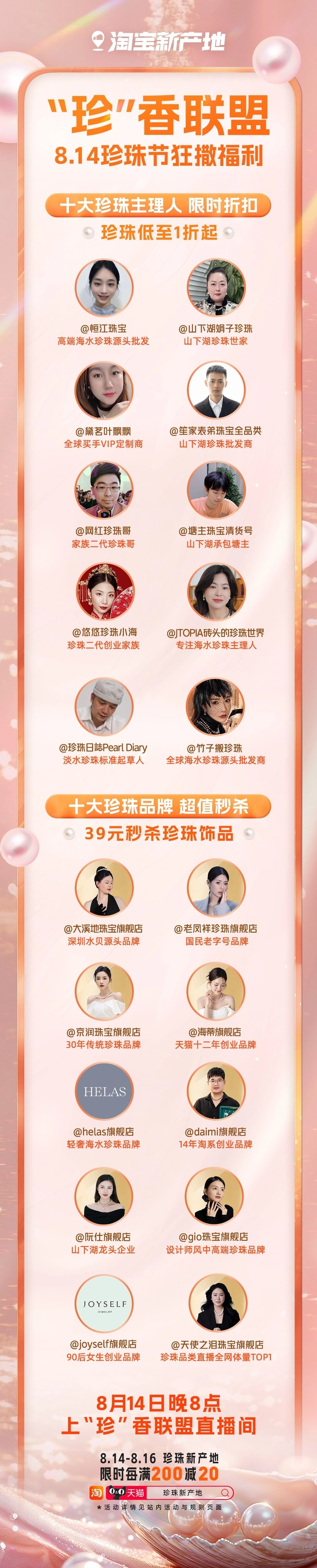 为了更好的推介源头好货,淘宝新产地”联动十大珍珠主理人和十大珍珠品牌组成“珍”香联盟,活动期间,超500家店铺开播,组成珍香联盟送惊喜福利,超级秒杀1折起、9.9元爆品限量抢,还有每满200减20优惠,让消费者稳稳实现“珍珠自由”。