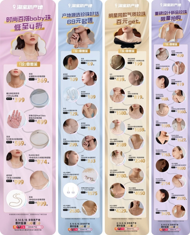 据悉,为了满足消费者差异化需求,助力优质产业带发展,淘宝天猫集团最新上线了产业带营销IP“淘宝新产地”,全链路扶持各类产业带优质货盘,助力产业带商家成长,同时向消费者传递“产地源选,好货不贵”的心智。8月14日到8月16日,淘天集团联合诸暨商务局举办“淘宝新产地·珍珠节”活动,给出亿级流量扶持产地好货,产地热卖款、明星同款、小众设计、轻奢珍藏款等好物应有尽有。