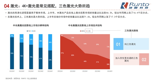 经过市场检验,“4K超高清+激光光源”已成为高端高画质投影消费的核心关键词。同时,数据显示三色激光技术已成为大势所趋,2024年上半年其在激光投影中占比已高达71.6%。同时,与中低端市场品牌众多的现象不同,高端投影市场呈现品牌集中度高的现象。2024年上半年,Vidda、极米、坚果、爱普生等排名前五品牌的合计销量和销额均超过98%。