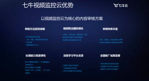 在自身业务不断发展壮大外,七牛云人工智能实验室 AtLab 也在深耕于一些重点应用。如在内容安全方面,七牛云利用人工智能机器视觉技术,对海量视频图像数据进行色情、暴恐、涉敏感人物的识别,保证互联网、广电、新媒体等行业以及政府机关等对数据传播的内容健康,数字空间的形成也使得内容安全成为不可忽视的问题。能够为七牛产品打造安全保护,构建安全存储、安全 CDN、安全直播的安全体系,确保内容安全。