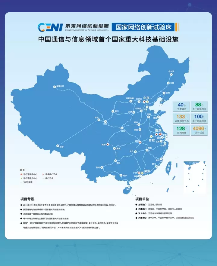 CENI是南京市第一个国家重大科技基础设施,推进CENI建设过程中,南京坚持“边建设、边开发、边提升”原则,先后与国家科研院所、网络运营商、互联网龙头企业、高校等100多家单位联合开展80余项战略性、基础性、前瞻性实验,得到广泛好评。