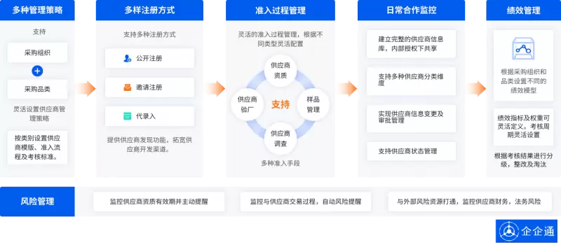 1、统一门户,建立供应商规范管理体系:构建南斗六星统一供应商门户,实现供应商从注册、资质审核、样品验证、现场考察的准入管控,并支持对不同类型供应商在各业务环节的不同纬度考核与评价,并提供供应商的改善与提升数据。