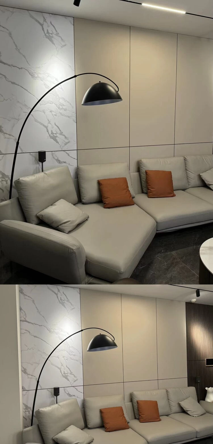 为了增加客厅的储物能力,客户选择在电视墙定制整墙电视柜,中间做嵌入式电视和soundbar/回音壁的设计,中间放电视和音响设备的位置用与柜门不同色的板材做了撞色,避免了墙面的单调,结合灯光设计更加提升氛围感。