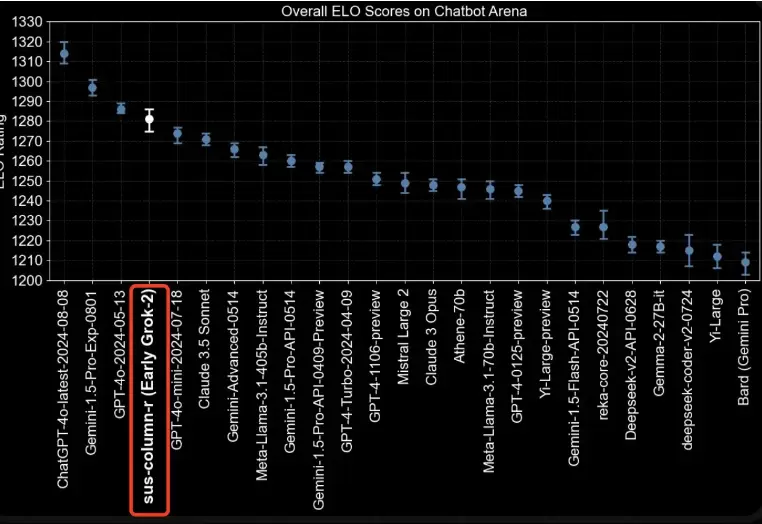 根据AI模型评测机构的排名,Grok-2的评分高于GPT-4o-mini和Claude 3.5 Sonnet,该模型的表现被认为优于Meta和Anthropic的最强模型。