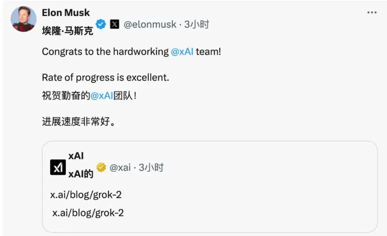 激动不已的马斯克接连发了数条有关 Grok 2 的推文,为其大力站台宣传,并盛赞 xAI 团队进展速度非常出色。作为大模型的“后来者”,马斯克对xAI寄予厚望,以此帮助他实现在今年年底构建世界上最强大AI的目标。