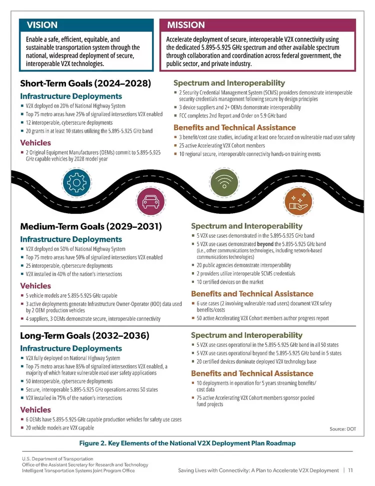 具体推进层面,该计划提出在2024年至2036年总共12年时间内,分为短期、中期、长期三个阶段,在美国全国加速C-V2X车联网全国部署。目标至2036年,建成覆盖美国全国范围的C-V2X蜂窝车联网,高速公路实现100%覆盖,75个大型主要城市十字路口覆盖率达到85%,其中大多数地区能够提供弱势交通参与者安全服务。