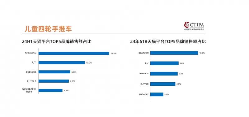 近期,中国玩具和婴童用品协会先后发布了《2024年618天猫平台数据分析报告—婴童用品》,以及《2024年上半年天猫平台数据分析报告》两份报告。据报告显示,在儿童四轮手推车品类中,DearMom分别以12.9%和13.0%的市场份额成为今年618乃至24上半年该品类最大单品。在消费降级的时代,以及众多新兴品牌不断涌入的情况下,作为高端婴儿车代表品牌的DearMom,是如何做到销售额同比上年增长了1.6个百分点,并在品类市场中独占鳌头的?