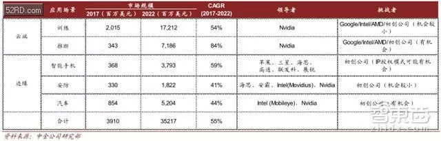 5、用于自动驾驶汽车的边缘推断芯片市场规模 2022 年将达到 52 亿美元,CAGR——44%。