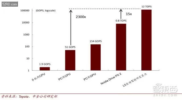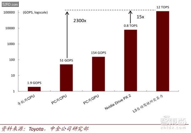 根据丰田公司的统计数据,实现 L5 级完全自动驾驶,至少需要 12TOPS 的推断算力,按现行先进的 Nvidia PX2 自动驾驶平台测算,差不多需要 15 块 PX2 车载计算机,才能满足完全自动驾驶的需求。