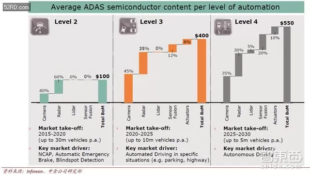 ▲英飞凌对各自动驾驶等级中半导体价值的预测