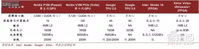 从整个云端训练芯片的市场竞争格局来看,目前 Nvidia GPU 的优势暂时明显,即便是 Google 的一些深度学习训练任务,同样离不开 Nvidia GPU;在 GPU 之外,云端训练的新入竞争者是谷歌的 TPU ,但目前并不对外直接销售;英特尔方面,则在积极布局 CPU+FPGA 异构计算,并持续优化 Xeon CPU 结构;同样深耕 FPGA 的还有 Xilinx ;GPU销量一直甚好的 AMD 也开始切入深度学习训练任务。