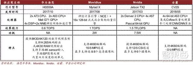 边缘推断芯片 在安防端的主要应用,基于将视频流在本地转化为结构化数据。这样既节省云端存储空间,也提升系统工作效率。因此,积极布局智能安防的除了英伟达、Movidius(计算机视觉创企),还有传统视频解码芯片厂商。业内,海思、安霸与 Nvidia 、Movidius形成有力竞争。