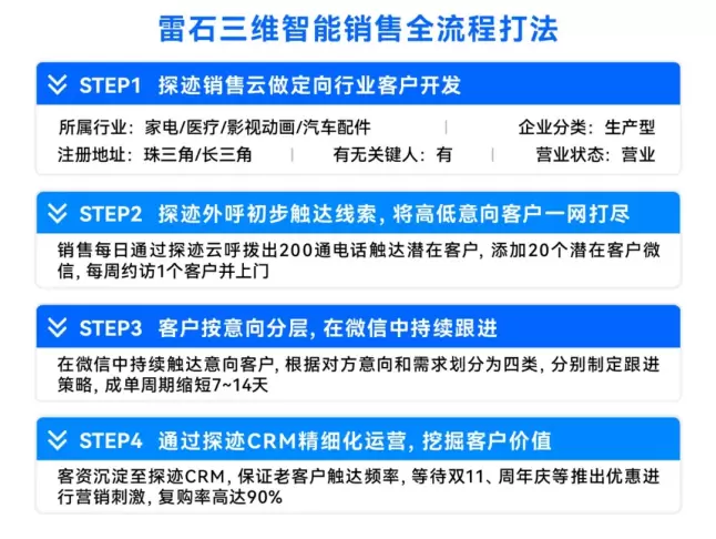 由于不同行业、不同应用场景对材料性能的要求各不相同,客户关注点呈现多元化,因此进一步把握他们的习惯和需求进行高效促单,是抓住市场机会的关键。在给潜在客户拨打电话时,销售会先从探迹销售云上了解该公司的行业、年营业额、出货情况,综合判断其公司实力,再根据对方产品用途预先准备沟通话术。若对方是影视动漫行业,产品多用于展示,那销售会推荐性价比高的光敏树脂,如果对方需要防水防晒、强韧性、耐腐蚀的产品,如制造汽车引擎、底盘等关键部件,则更适合用尼龙和金属材料。销售通过电话沟通快速定位需求,输出客户满意的解决方案,激活成交意愿。经过一年多的合作,目前雷石三维的获客方式从直销陌拜升级为电销、面销、网销多种链路联合拓客,进一步提升品牌影响力。由于线索精准度高、销售人员谈单能力强,最快实现10分钟成单,可以说线索成本与成单成本都有明显下降,这意味着雷石可以在不牺牲质量的前提下提高成本竞争力,持续提升市场份额。