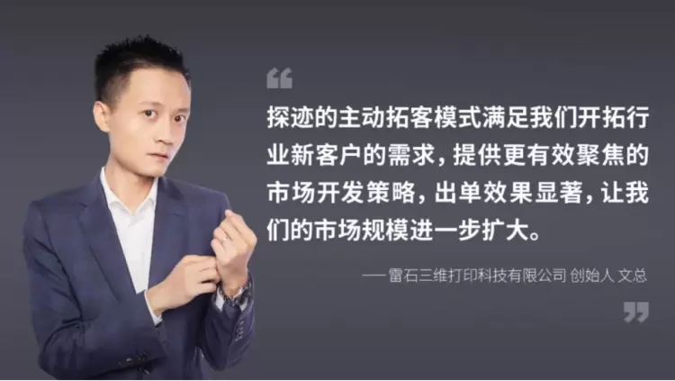 雷石三维去年营收过亿,目前拥有设备上千台,创始人文总入行近10年,算得上第一批“吃螃蟹”的人。他提到,近年来不少企业为了冲量而压价,整体利润率下滑了60%左右,行业已经过了“最赚钱的时候”。文总举例道:“3D打印一般按重量计价,以最常见的光敏树脂材料为例,市场均价在0.4元/g左右,现在内卷严重,0.2元/g都有人做。”为应对肆虐不已的价格战,雷石三维也走上销售转型的道路,2023年文总在市场营销中先后投入100多万。作为90后企业家,文总的想法和看法都很“新”,他认为不少传统行业已步入成熟期,而3D打印行业处于成长期,还是有不少机会,就看用什么方式获取。一次偶然的机会,文总接触到探迹销售云,他发现这种“新型”获客方式能以前所未有的精准度获取、触达潜在客户,这种主动拓客的方式正是自己目前或缺的,文总认为值得一试。