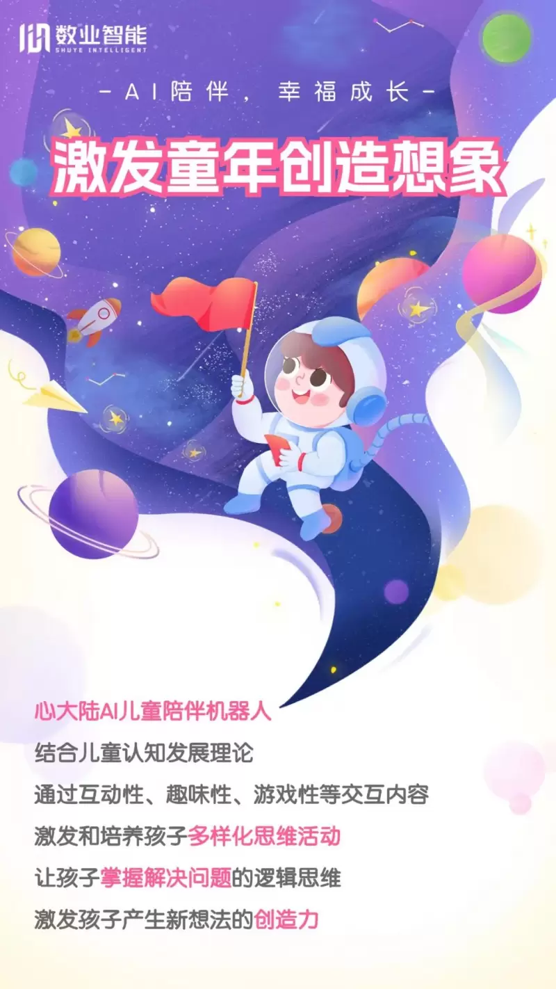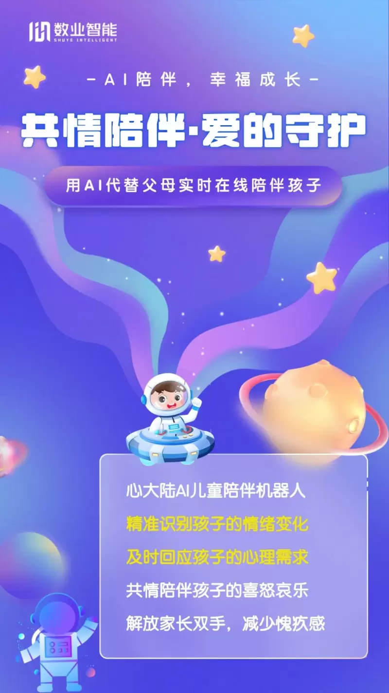 这些情况在儿童早期发育阶段爸爸妈妈可以通过科学性、系统化的陪伴和引导,而父母往往因为工作忙,家务多,使得孩子的陪伴成为了“奢侈”,父母也会因此产生愧疚感。面对中国儿童在早期科学养育的问题,数业智能心大陆基于多年来在AI心理健康领域所承担的社会责任,深入研究儿童心理发展体系,结合自研的AI大模型技术,即将推出一款面向3-8岁孩子具备科学系统化、共情对话的AI儿童陪伴机器人。