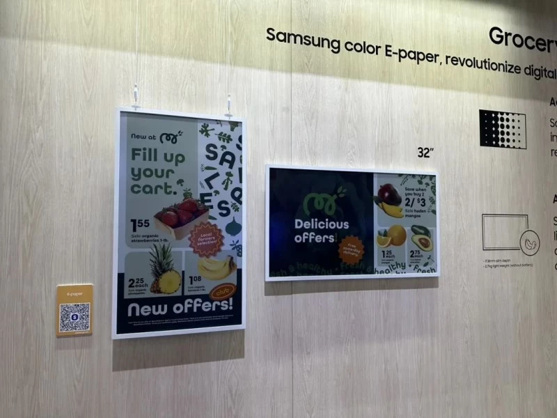 彩色电子纸显示屏:三星展示了型号为EMDX的32英寸彩色电子纸显示屏,作为三星首次推出的电子纸显示屏产品,主要用于广告展示。