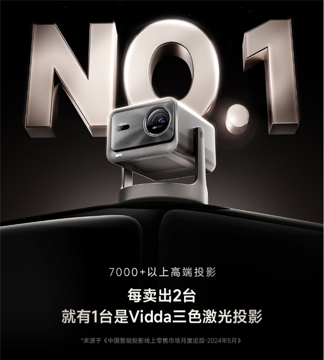 正是因为以上种种,使得Vidda成为了上半年表现最为亮眼的投影品牌。在行业整体增速不大的背景下,2024年1~6月,Vidda投影销量同比增长68.5%,销额同比增长67.9%,线上4K投影和激光市场,Vidda均跻身前三甲;8000+元超高端市场的销量份额中,Vidda占比达到36.1%,位列第一。