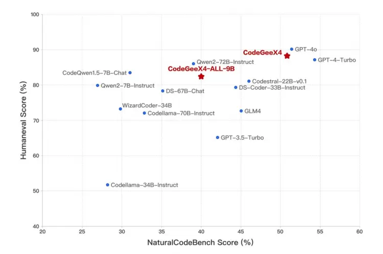 第四代代码模型CodeGeeX4堪称代码生成大模型的“六边形战士”,已经发布的CodeGeeX4-ALL-9B 仅用百亿级参数实现模型精度超越业界主流产品。在NaturalCodebench等测试基准上,相对于更大的模型实现了性能反超。