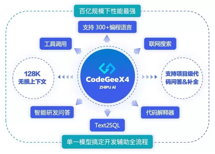 CodeGeeX4单一模型实现编程开发全流程覆盖,包括需求设计、前端开发、后端开发、数据处理等场景,支持代码补全和生成、代码问答、代码解释器、工具调用、联网搜索、项目级代码问答等全面能力。模型长序列达128K,支持中文、英文、俄语、法语、西班牙语等20+自然语言和300+编程语言。同时,在模型推理可实现单卡部署,最低24GB显存即可进行量化推理,用户可在本地私有化部署,保护企业代码安全。