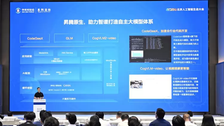 2024年8月19日,北京人工智能生态大会在中关村国家自主创新示范区会议中心颐和厅成功召开。智谱CEO张鹏作专题分享,简要介绍了昇腾对自主创新的智谱大模型的助力,以及正在打造的基于昇腾的第四代代码模型CodeGeeX4和多模态模型CogVLM2-video,华为昇腾计算业务副总裁刘鑫介绍昇腾原生进展。