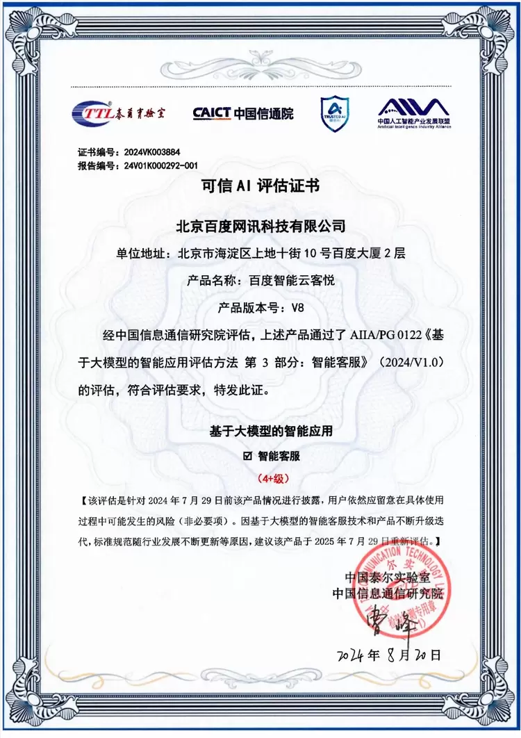 百度智能云客悦首家通过信通院“基于大模型的智能客服”评估