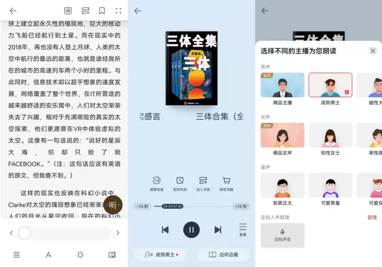 在这个数字化的时代,书籍不仅能用来看,还能随时听。无论每天通勤的地铁或者公交上,还是午间的散步消食、闭目养神,抑或傍晚的健身、家务时光,都可以通过听书功能进入书籍世界。虽然目前主流的阅读类软件基本都已具备听书功能,但多为略显生硬的机械男女声,在还原场景氛围、人物语气、故事情节起伏等方面经常差强人意。