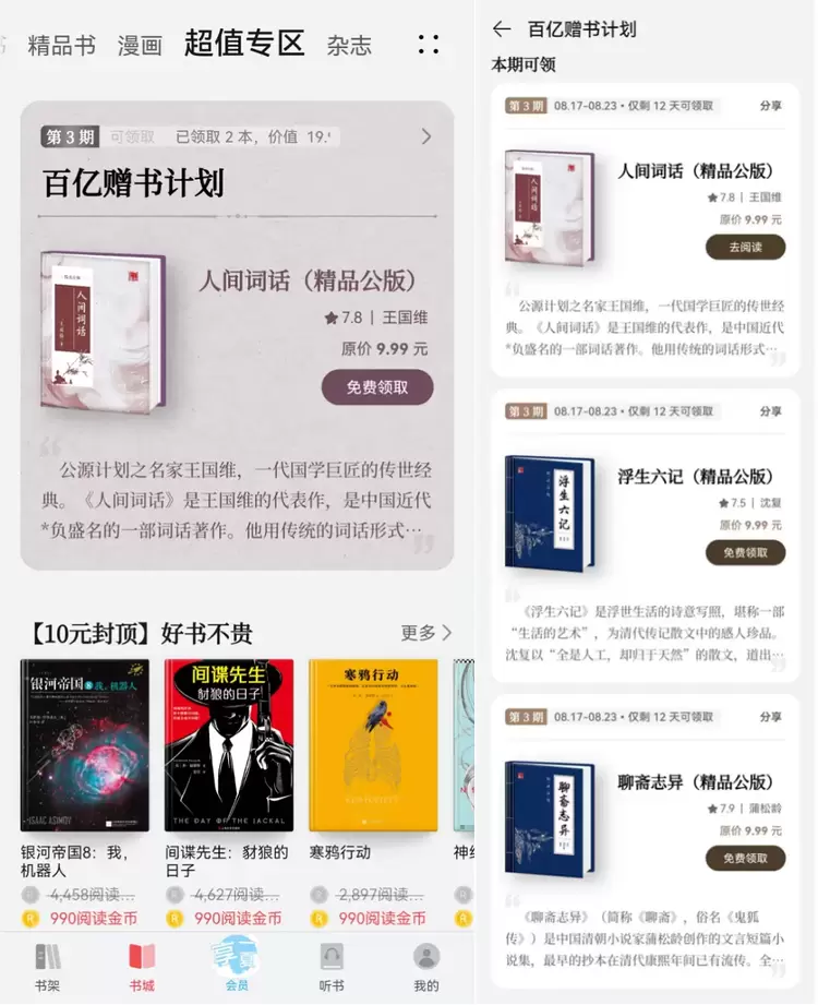 现在打开华为阅读,从“书城”顶部的“超值专区”即可进入“百亿赠书计划”页面领取免费赠书,领取之后还能一键分享给朋友。接下来,华为阅读“百亿赠书计划”还将免费赠送更多具有深远影响的作品,让来自不同领域和圈层的读者都能零距离感受经典书籍带来的智慧和力量。