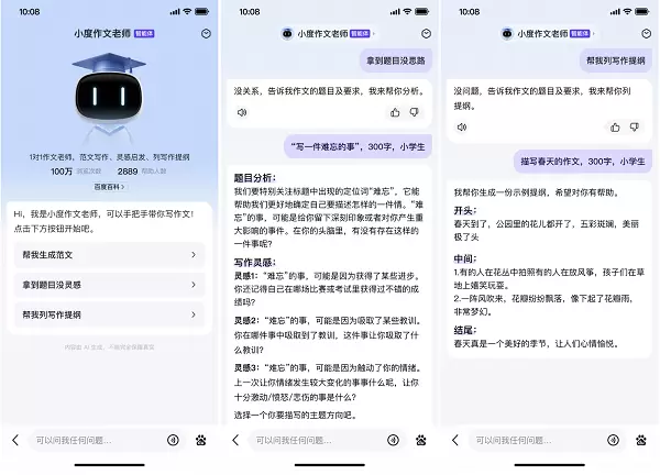 「小度作文老师」是基于文心智能体平台专门打造的智能体。不仅配备范文学习、帮作文审题和选材思路、帮列写作提纲等功能,还升级了1对1专属作文导师服务,可实现1对1定制化范文学习、写作大纲,1对1帮助审题、激发写作灵感,并将经验丰富的作文专家的教学方法融入智能体当中,让学生无需面对面也能享受到顶级教育资源,轻松掌握高分作文的秘诀。