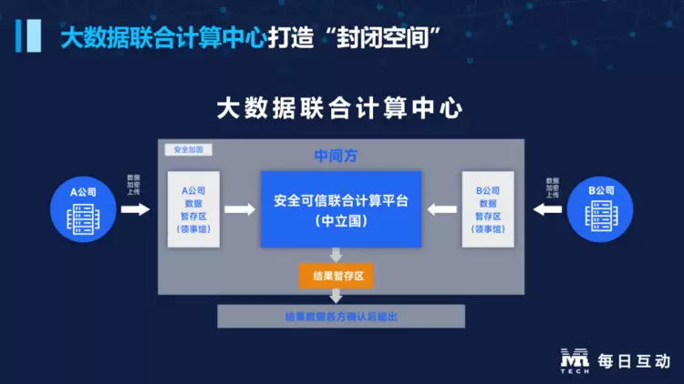 因此,对于业界仍旧存在的“不敢、不愿、不会”共享数据的态度,方毅建议要做到对数据的“分级、分类”管理和“分场景、封场景”使用并行。用机制保障分场景论证,用装置保障封场景使用,从而做到“数据可用而不可见”,让数据非必要不流转,数据价值畅通流转。此外,每日互动首倡了大数据联合计算模式。该模式采用“中立区”“领事区”等计算方式,实现了不同量级数据计算中数据控制权和使用权分离,计算结果双方确认后输出而原始数据销毁,真正在安全的前提下解决了“大”数据融合中效率和成本的问题,为数据行业发展修建了封闭的“高速公路”。