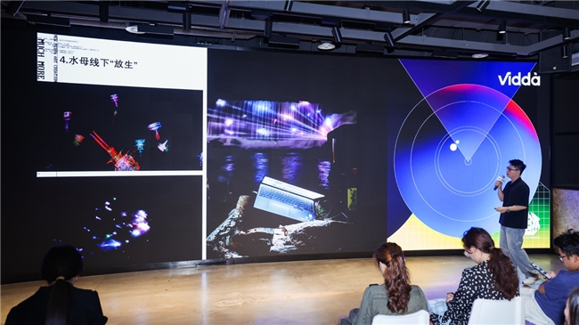 本次参赛作品《水母漂流计划》创作者潘志彬(Much More.主理人)也在品鉴会上也进行了作品分享:“作品利用数字新媒体技术,将图片转化为水母形象,通过一台激光投影,带着它们进行了一场奇幻的放生活动。这个作品对投影亮度和便携度要求高,我们一开始担心普通的家用投影难以达到效果,在拿到Vidda后,这个顾虑就打消了,Vidda使得作品有了更多维度的再创。让光拥有生命,这是一件浪漫的事儿,也是我们的创作初衷。”