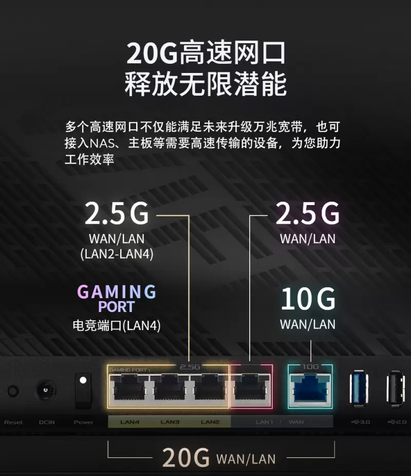 在接口方面,BE86U也进行了全面升级。它配备了1个10G口和4个2.5G口,至高可传输20G的数据。这样的配置不仅能满足未来升级万兆宽带的需求,还能接入NAS、主板等需要高速传输的设备,为我们的工作和生活带来更大的便利。