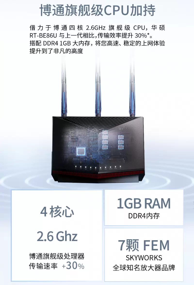 作为一款高端路由器,BE86U在硬件配置上也毫不妥协。它采用了博通16nm四核2.6GHz旗舰级处理器,并配备了DDR4 1GB大内存,7颗FEM(SKYWORKS全球知名信号放大器)这样的配置不仅保证了BE86U在处理复杂网络任务时的游刃有余,还进一步释放了其强大的性能。